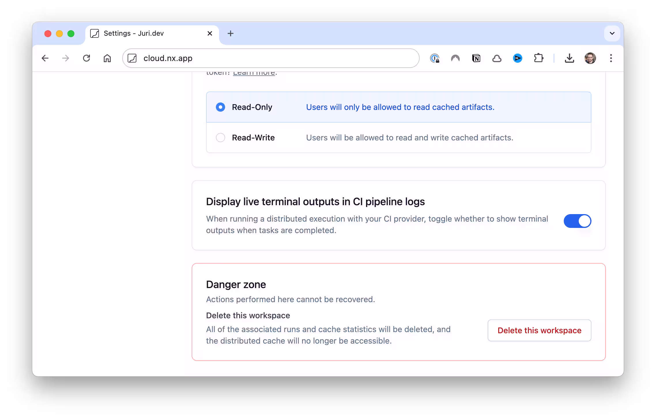 If you prefer the previous log view in your CI, you can opt-out of the new table view. Simply go to your Nx Cloud workspace settings and enable the "Display live terminal outputs in CI pipeline log" option.